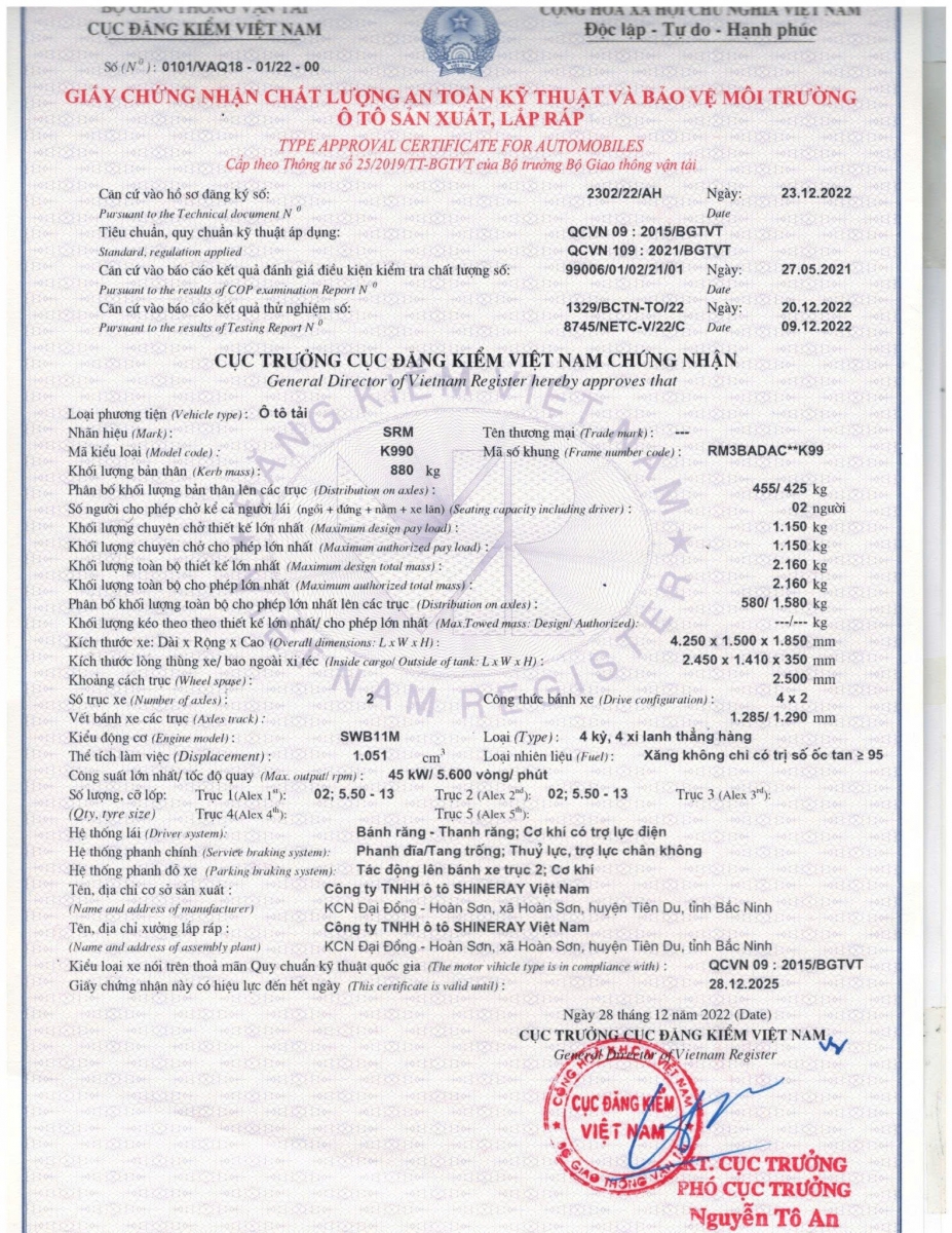 Mẫu xe K990 của nhà SRM với mức giá dao động từ 160 triệu đồng đến 235 triệu đồng tùy loại thùng xe và hỗ trợ gắn máy lạnh. Xe có 5 loại thùng và được Cục Đăng Kiểm cấp giấy chứng nhận xuất xưởng: