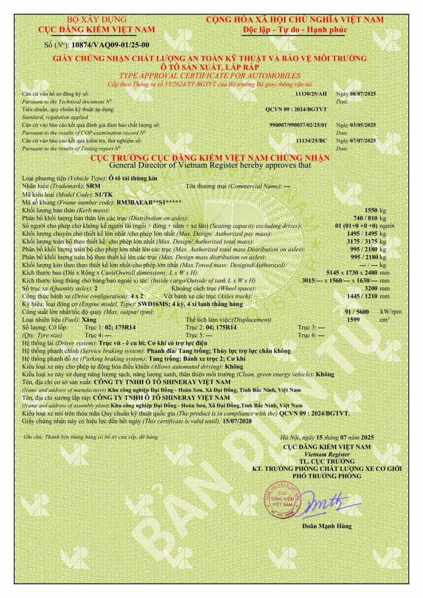 Xe tải SRM S1 1.5 tấn Thùng kín sở hữu thiết kế chắc chắn, thùng kín bền đẹp, phù hợp nhiều mặt hàng. Động cơ mạnh mẽ, tiết kiệm nhiên liệu vượt trội. Nội thất tiện nghi, lái êm và dễ điều khiển. Giá thành lại hợp lý, bảo hành dài lâu, phụ tùng sẵn có. Và là Thương hiệu uy tín, được nhiều khách hàng tin dùng. là lựa chọn hàng đầu cho những ai đang tìm kiếm một chiếc xe tải nhẹ bền bỉ, tiết kiệm nhiên liệu và giá cả phải chăng. Vì vậy SRM S1 1.5 tấn xứng đáng là " Người bạn đồng hành" đáng tin cạnh cho Hộ cá nhân và Doanh nghiệp.