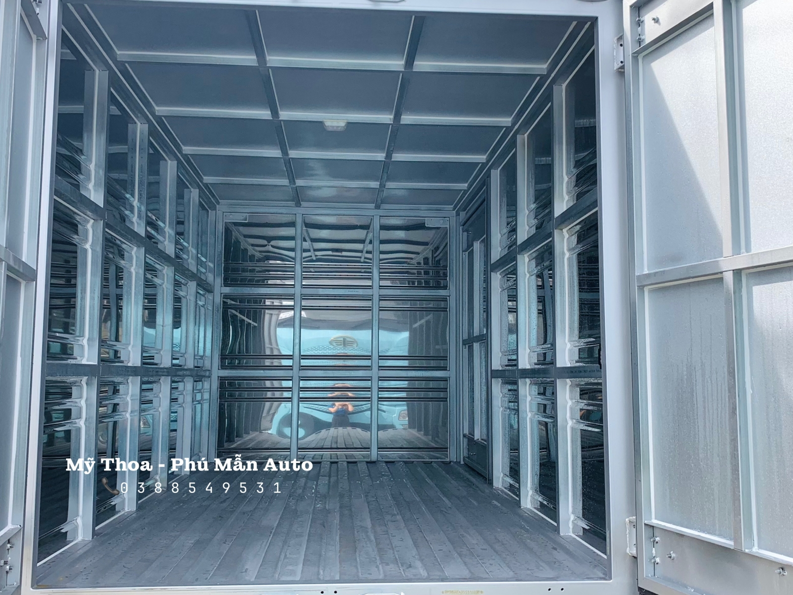 Thùng có kích thước lọt lòng dài 3.050 mm, rộng 1.560 mm, cao 1.630 mm, giúp tối ưu không gian chở hàng, phù hợp với nhiều loại hàng hóa cần bảo quản kín, dễ dàng di chuyển trong đô thị hoặc khu vực đông dân cư. Và kích thước tổng thể là 5.130 x 1.730 x 2.480 mm. Cửa sau mở hai cánh, có 1 cửa hông, bản lề chắc chắn, giúp bốc dỡ hàng hóa dễ dàng, linh hoạt và an toàn bằng cả tay và xe nâng.